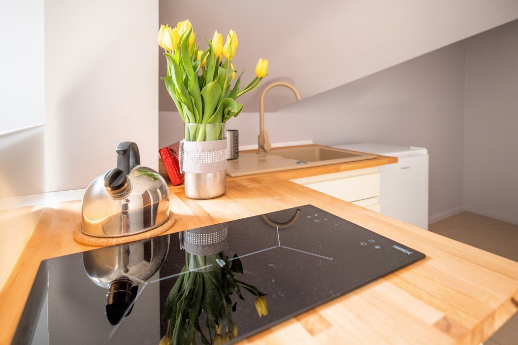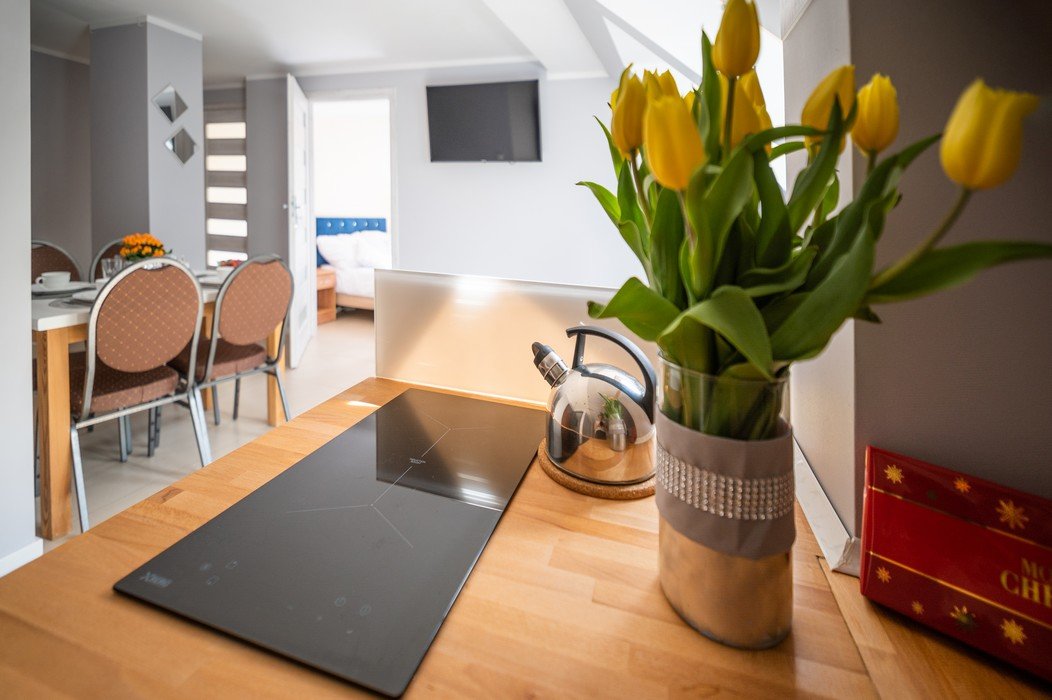 • Aneks kuchenny w apartamencie z pełnym wyposażeniem (2 palnikowa kuchenka indukcyjna, mikrofalówka, garnki, zlewozmywak, przybory kuchenne).